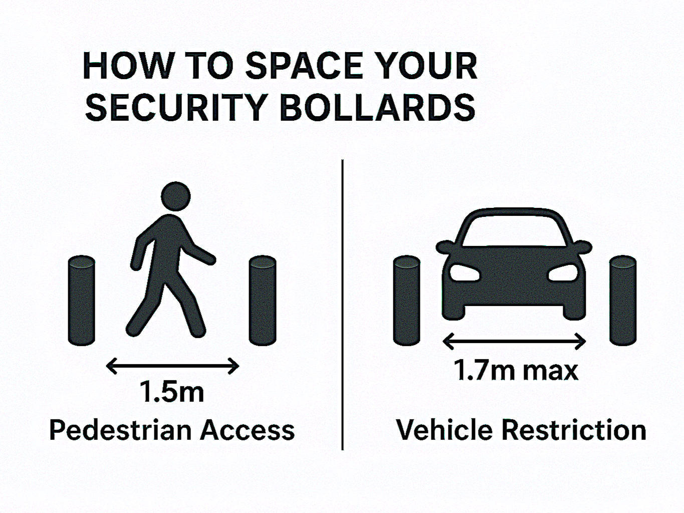 When installing security bollards, correct spacing is essential to balance pedestrian access with vehicle restriction.